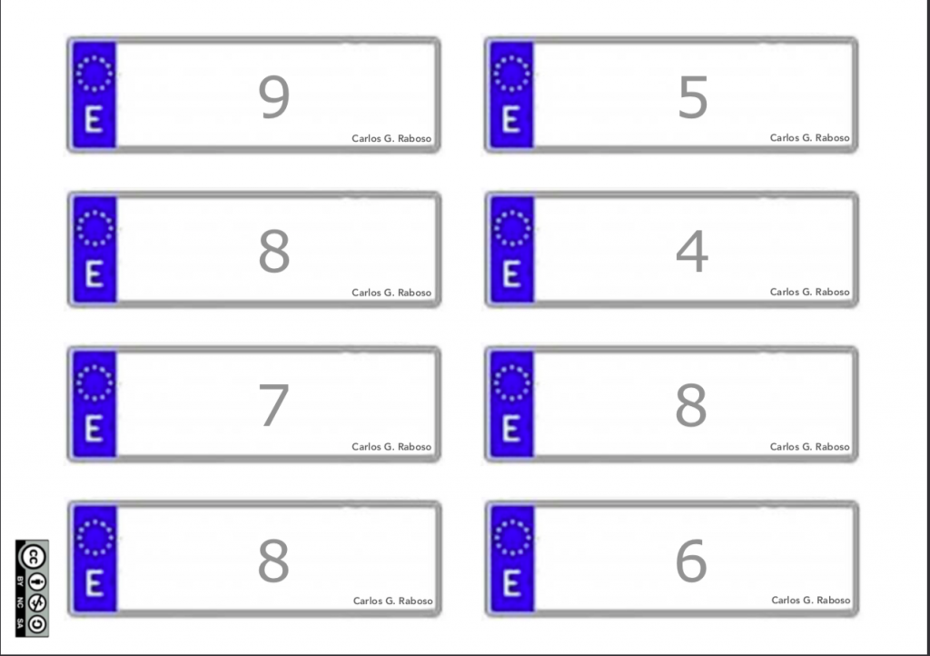 – 32 matrículas con 4 dígitos (no corresponde a ninguna fase pero, ya puestos, he querido añadir otro juego de tarjetas en el que se sumen todas las cifras)