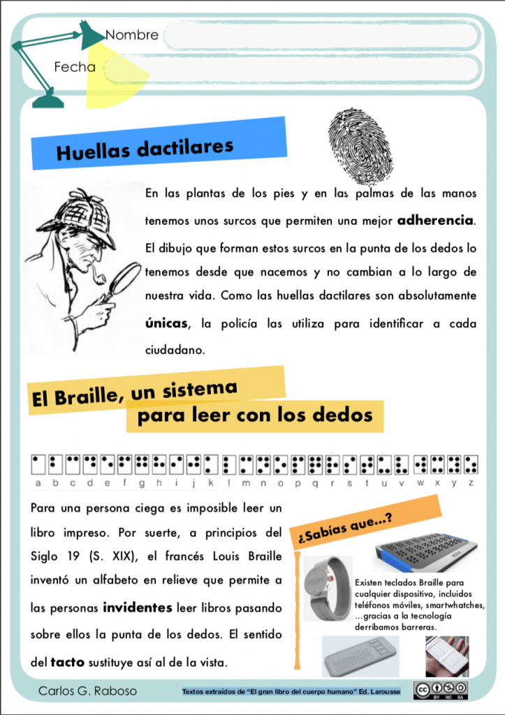 Actividad de lectura comprensiva sobre textos informativos para un nivel del Tercer Ciclo de Primaria. En el se plantea unos breves párrafos explicativos sobre las huellas y el braille extraídos del “El gran libro del cuerpo humano” de la Editorial Larousse, acompañados de una segunda ficha con preguntas de comprensión lectora, acompañadas de una simpática y motivadora actividad para escribir el nombre del alumno en braille.