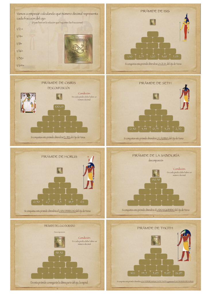 Tras la presentación con la historia del «ojo de Horus» empieza la actividad gamificada. En la primera pantalla se presenta el ojo de Horus dividido en seis regiones con fracciones, que en la siguiente pantalla se transformarán en números decimales. El resto de pantallas contienen una prueba piramidal a la que se le suma una última, con la que se obtiene la magia de Thoth; que puede simbolizar la idea de que nada es perfecto.