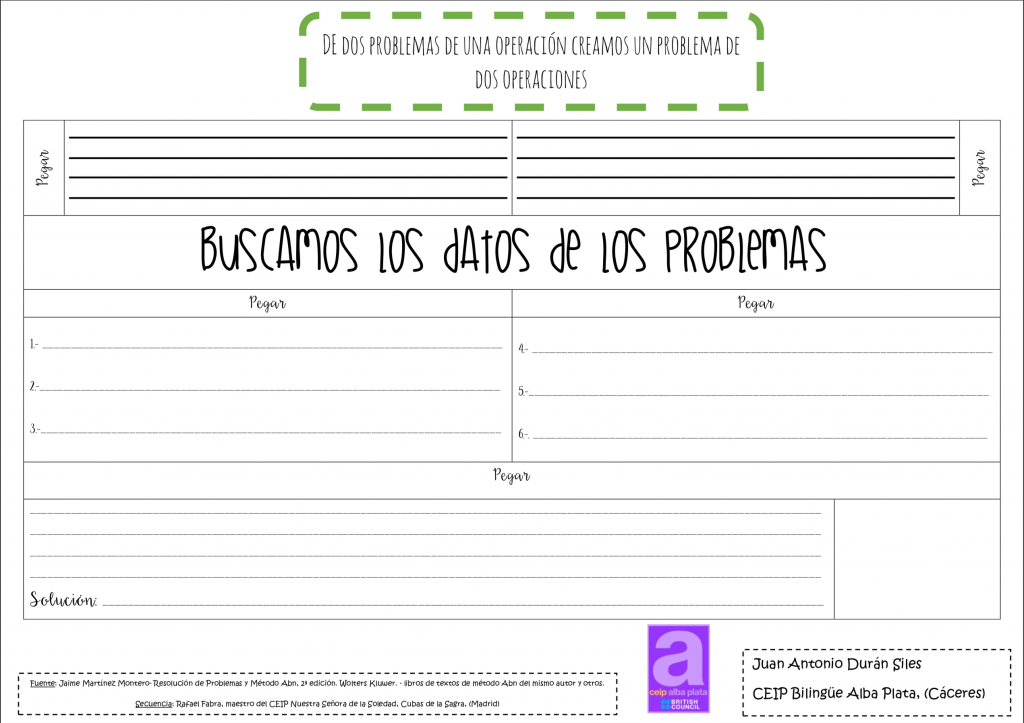 Este material está basado en el libro «Resolución de Problemas y Método ABN» de Jaime Martínez Montero y Concha Sánchez Cortés, 2ª edición. Wolters Kluwer en los libros de textos del método ABN del mismo autor y otros, así como en la secuencia realizada por Rafael Fabra, maestro del CEIP Nuestra Señora de la Soledad, Cubas de la Sagra, (Madrid).
