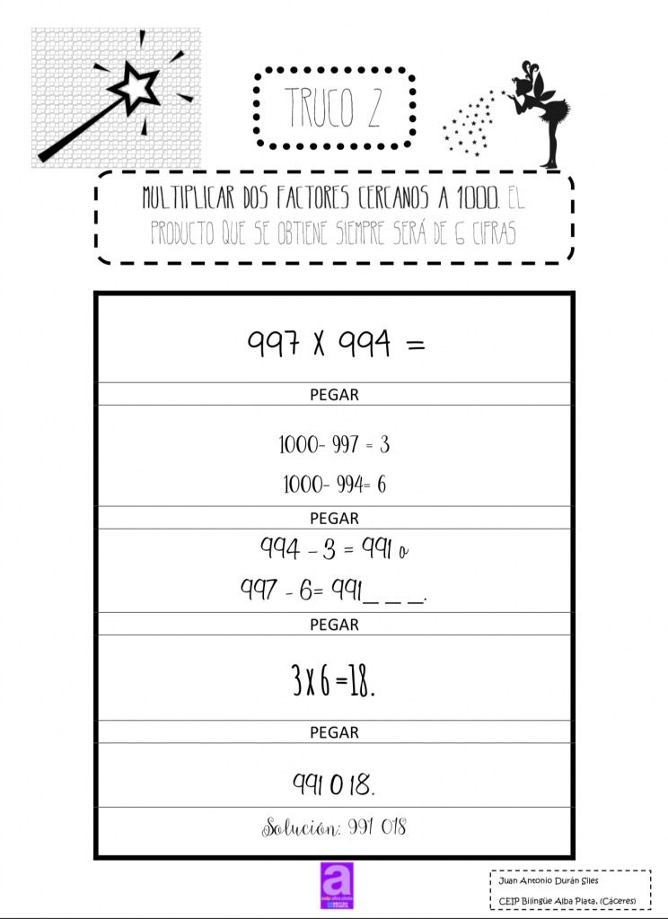 Juan Antonio Durán Siles maestro en el CEIP Bilingüe ”Alba Plata” de Cáceres, nos envía un recurso que en sí es una auténtica maravilla para trabajar con el alumnado la secuencia de dificultad para trabajar el «Truco» para la multiplicación de dos factores cercanos a mil.