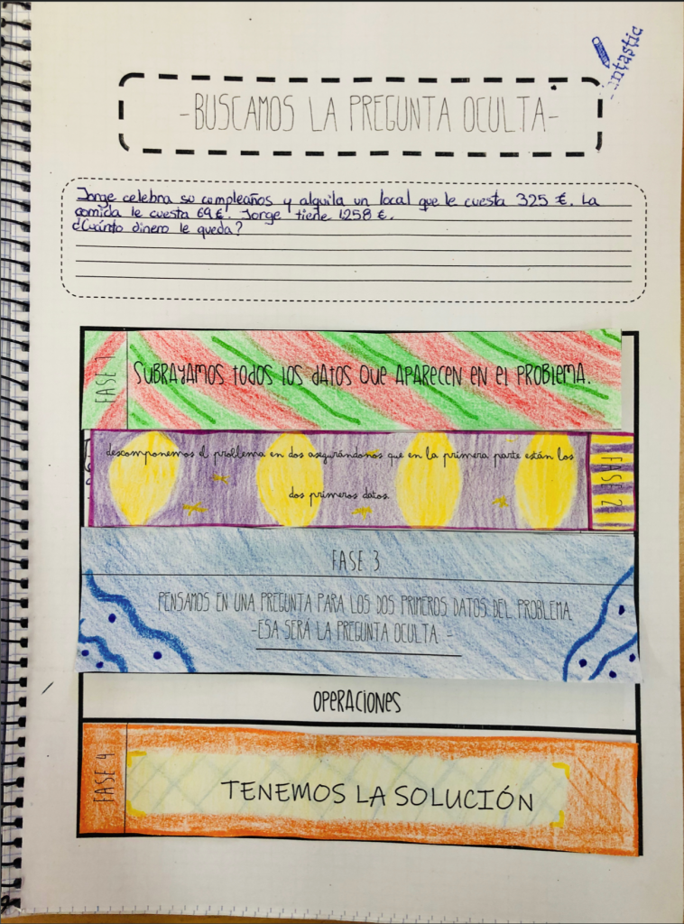 Juan Antonio Durán Siles maestro en el CEIP Bilingüe ”Alba Plata” de Cáceres, nos envía un nuevo Lapbook de la fase 4 de la Resolución de Problemas de dos operaciones y un documento con ejemplos de sus alumnos. En esta ocasión, una vez dado un problema de dos operaciones los chicos/as tienen que buscar la pregunta oculta. Para ellos seguimos 4 fases: