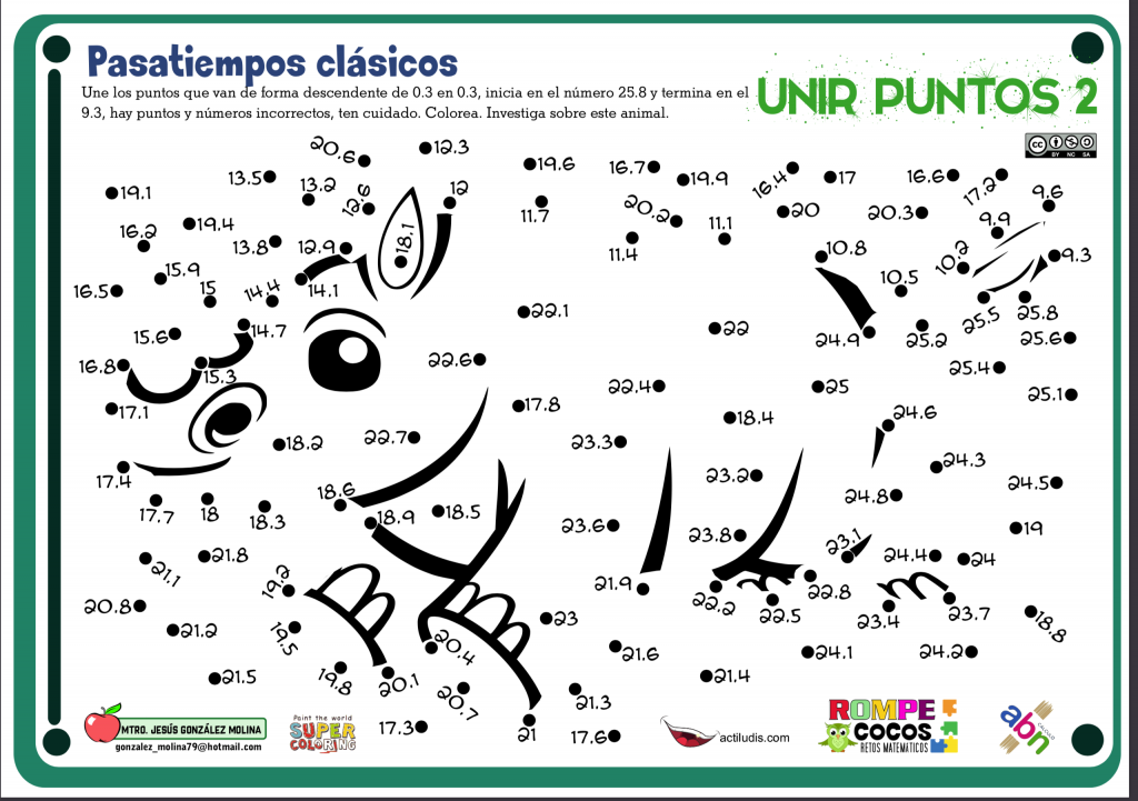 El Profesor Jesús González Molina, docente en la Escuela Primaria Vicente Guerrero y catedrático en el nivel de posgrados, desde Los Placeres del Oro en el estado de Guerrero, México, nos envía un pasatiempos clásico que consiste en unir puntos partiendo de un número determinado, con una secuencia establecida, hasta llegar a otro número final. En esta ocasión en sentido descendente. Se formará una figura que permanece escondida y de la cual pueden investigar.