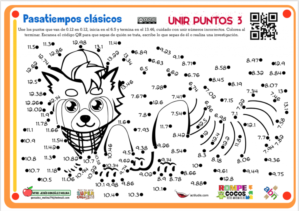El Profesor Jesús González Molina, docente en la Escuela Primaria Vicente Guerrero y catedrático en el nivel de posgrados, desde Los Placeres del Oro en el estado de Guerrero, México, nos envía un pasatiempos clásico que consiste en unir puntos partiendo de un número determinado, con una secuencia establecida, hasta llegar a otro número final. Aparecerá un personaje escondido. En esta ficha hay un código QR que deberán escanear para saber de quién se trata, también podrán escribir sobre él lo que sepan o hacer una investigación.