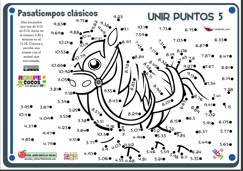 El Profesor Jesús González Molina, docente en la Escuela Primaria Vicente Guerrero y catedrático en el nivel de posgrados, desde Los Placeres del Oro en el estado de Guerrero, México, nos envía un pasatiempos clásico que consiste en unir puntos partiendo de un número determinado, con una secuencia establecida, hasta llegar a otro número final. Cuando descubran el dibujo escondido podrán colorearlo y escribir una poesía del mismo.