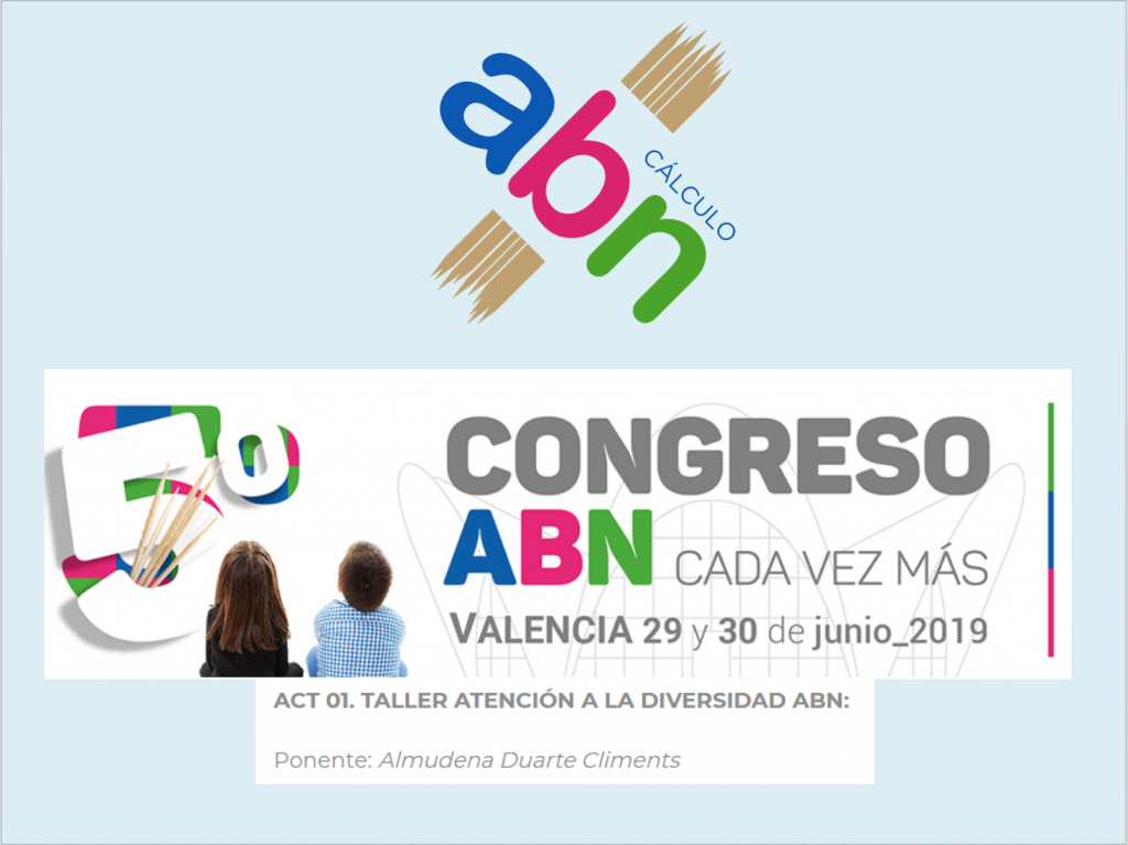 Presentación de la actividad nº 1 «Taller atención a la diversidad ABN» llevado a cabo por Almudena Duarte Climents. En su taller se habló de organización del aula, del tiempo dedicado, de la programación, de lo que hacen en clase, de materiales y de la evaluación con el referentes siempre de los alumnos.