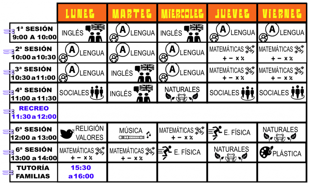 Para el horario de clases además de escribir el nombre de las distintas áreas, añadir un icono identificativo a cada una de ellas, al objeto de hacer más fácil la transición a la lectura y a la vez al reconocimiento de cada una de ellas. Como complemento se pueden colorear cada área de un color diferente, con lo cual aún será más fácil localizarlas.