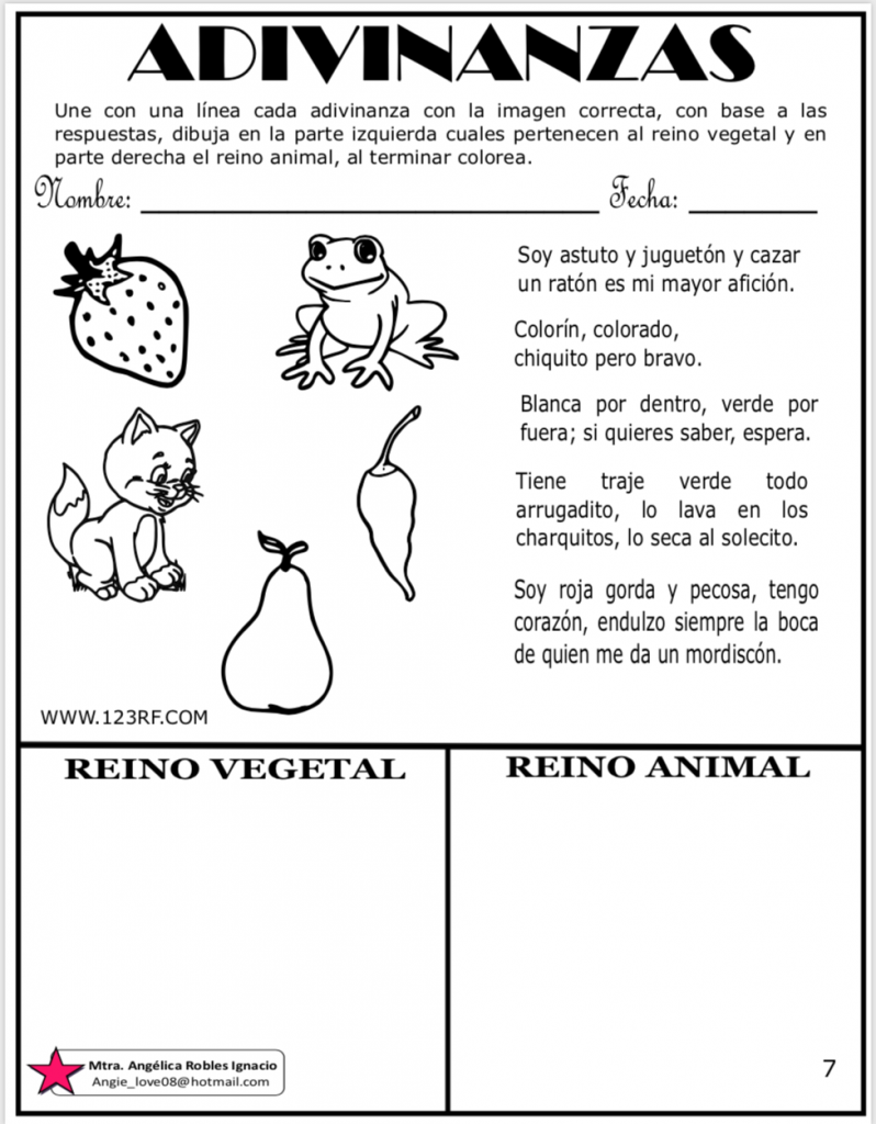 En esta actividad deberán unir con una línea la adivinanza con la imagen que le corresponde. Finalmente deberán dibujar cuáles pertenecen al reino animal y cuáles al reino vegetal.
