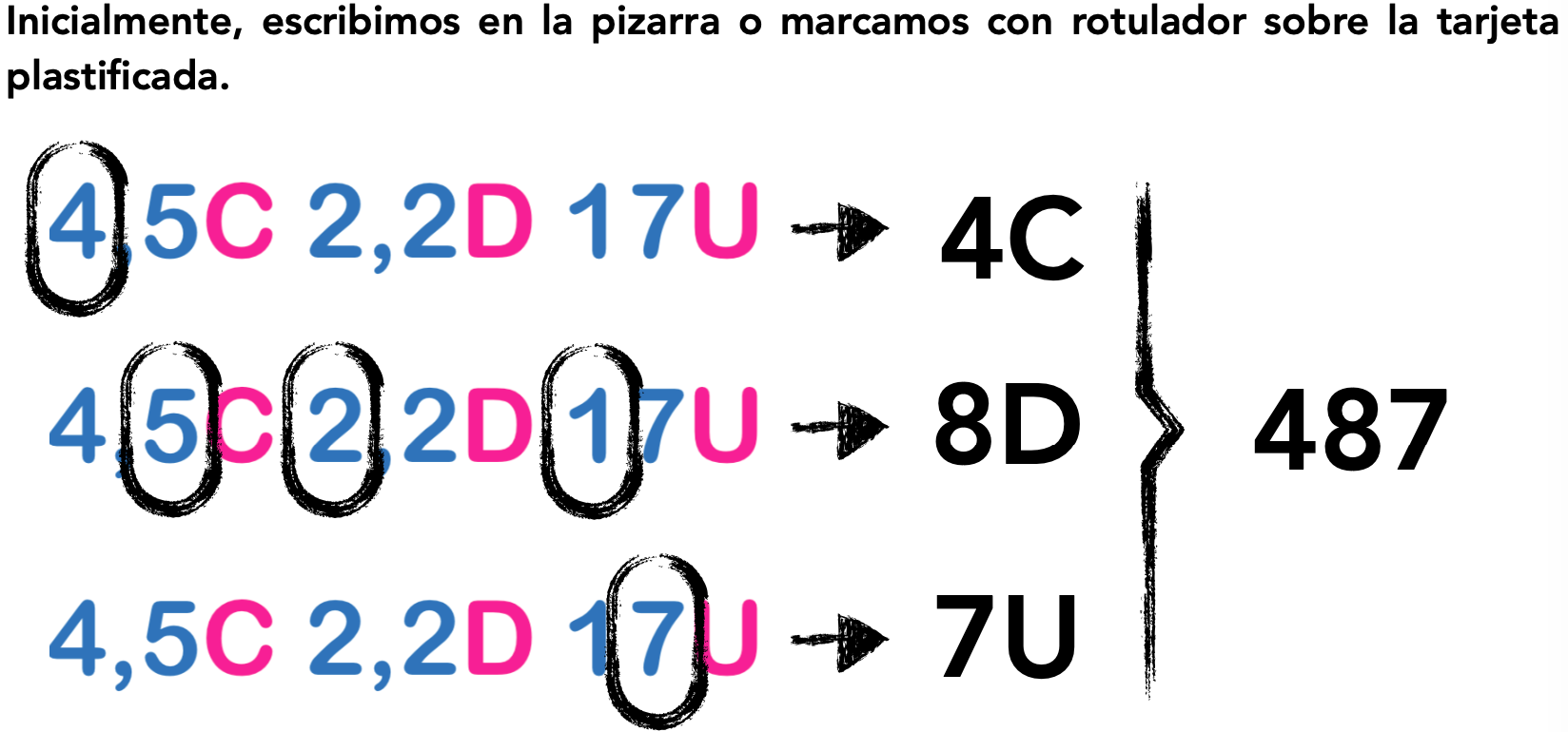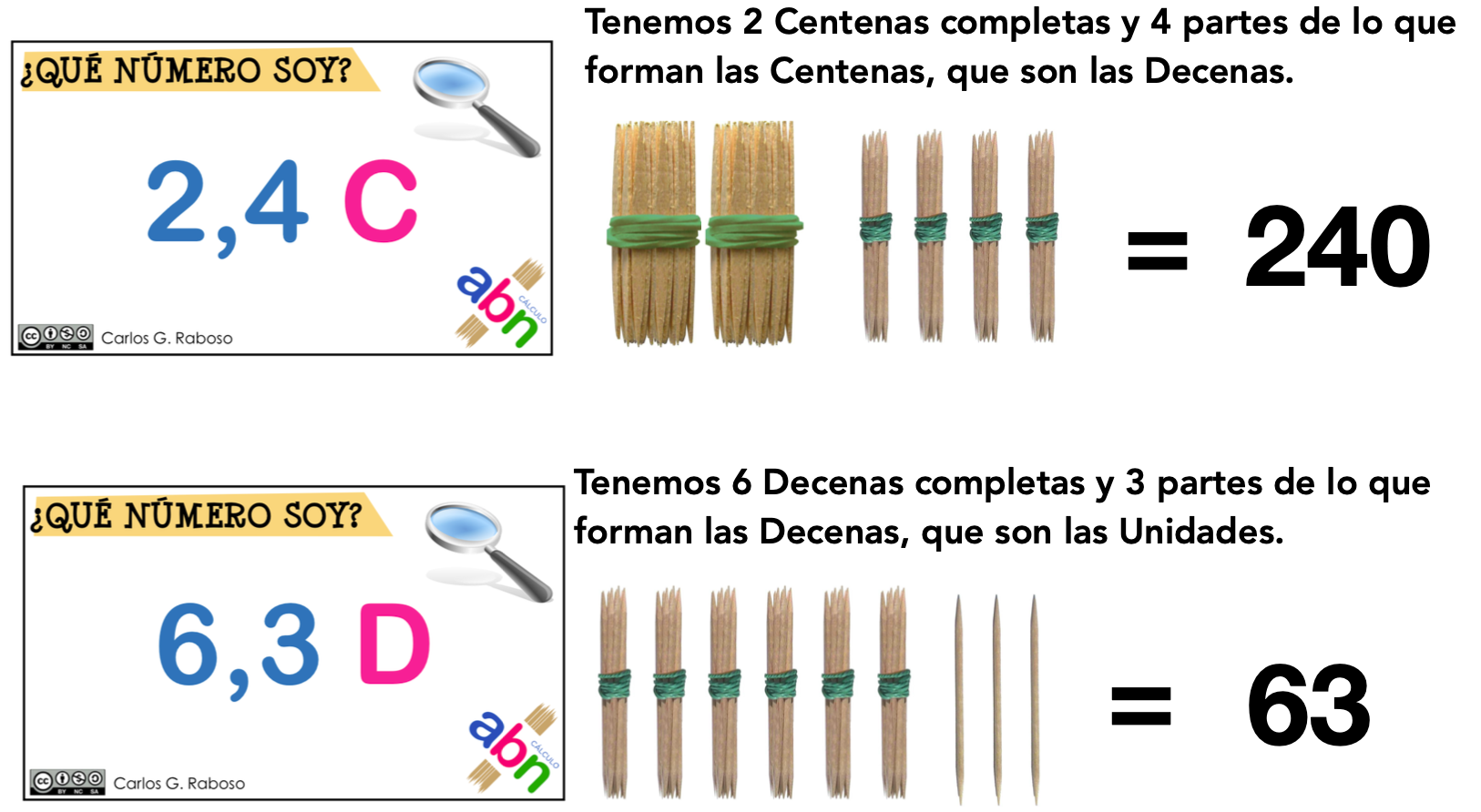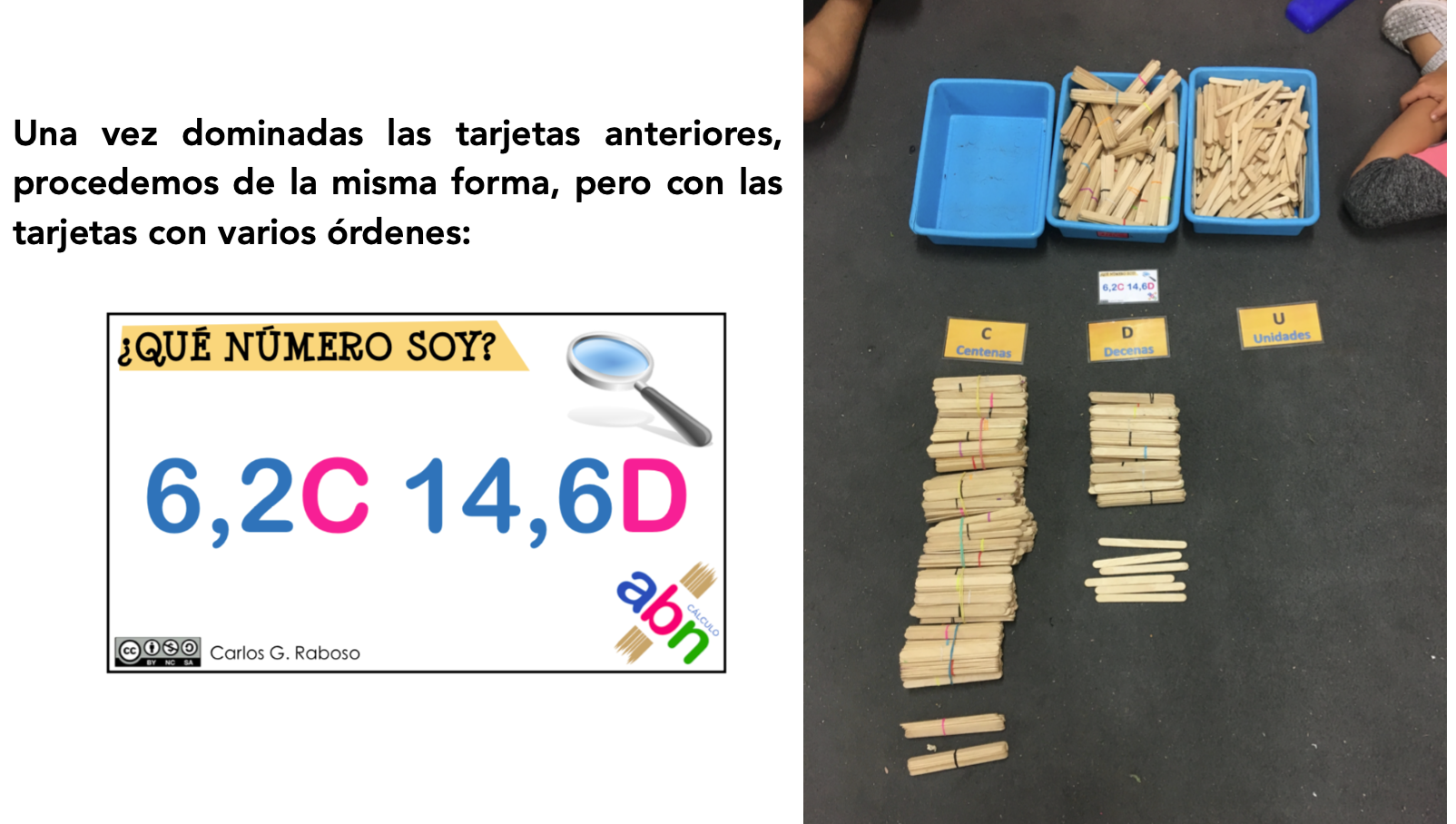 Iniciamos con las tarjetas con un solo orden de unidad. Representamos con palillos cada una de las tarjetas, haciendo especial hincapié en el significado: