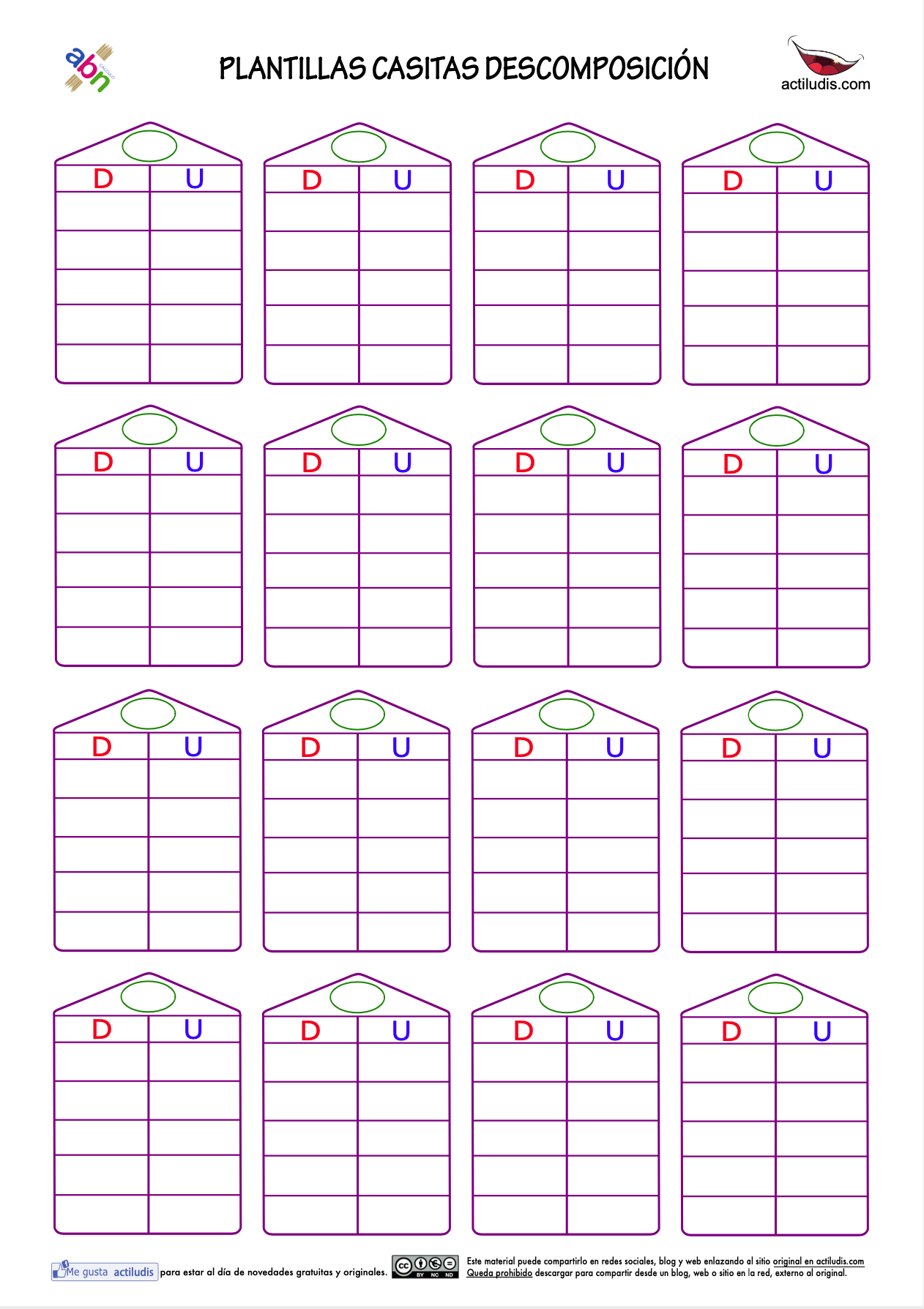Las siguientes plantillas son de Miguel de la Rosa Zurera, en ellas podemos descargar «casitas de descomposición» y plantillas además con el «adosado». Son plantillas para descomposiciones hasta el 100. La razón por la que las ha realizado es que el alumnado del 1ºde Primaria no suelen dibujarlas bien en sus cuadernos y con estas plantillas puedes imprimir y recortarlas para que las peguen en sus cuadernos y sobre ellas realizar las actividades.