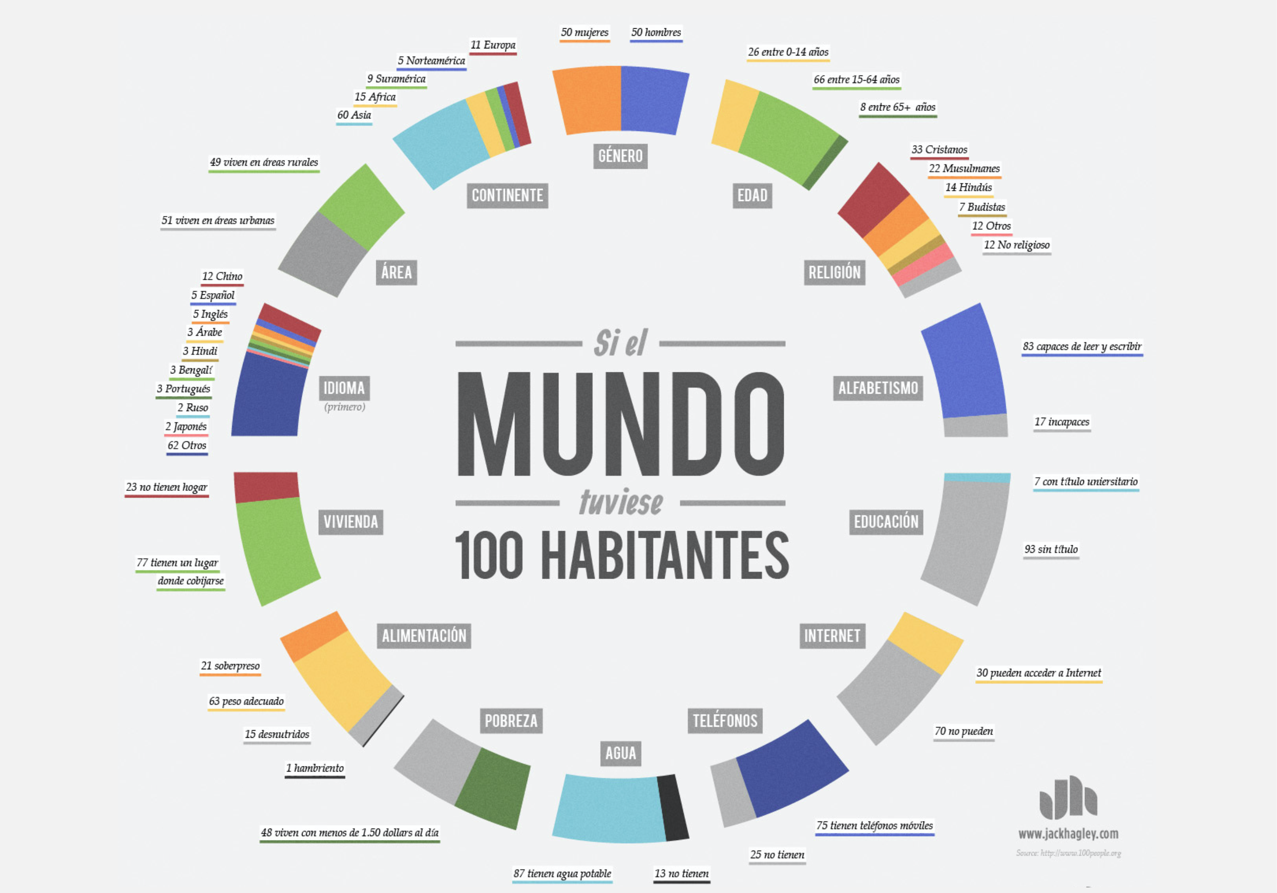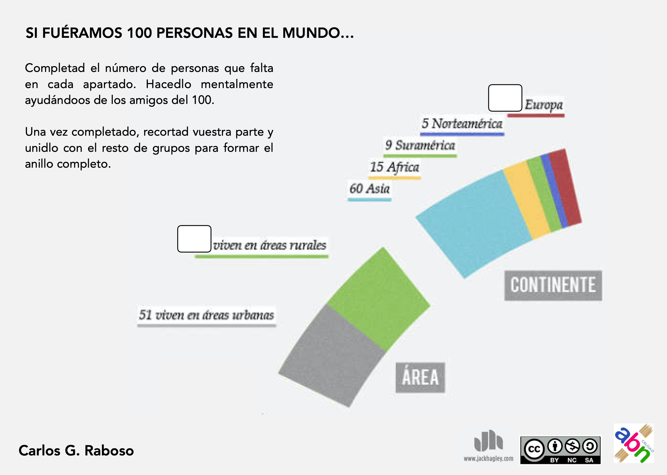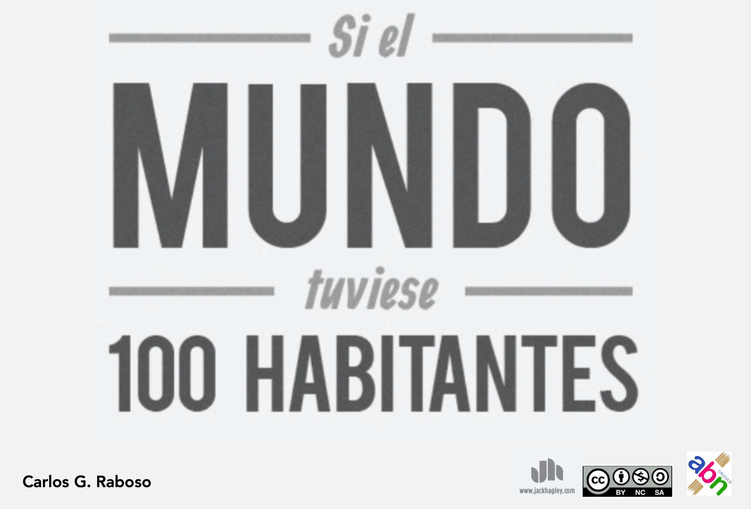 Si el mundo tuviese sólo 100 personas es una actividad en la cual se parte de una gráfica en la que aparecen distintos aspectos relacionados con la humanidad (género, edad, continentes, idiomas, vivienda, religión, internet,…) y con ella Carlos García Raboso aprovecha y la dividido en varios grupos ocultando en cada uno de ellos un dato.
