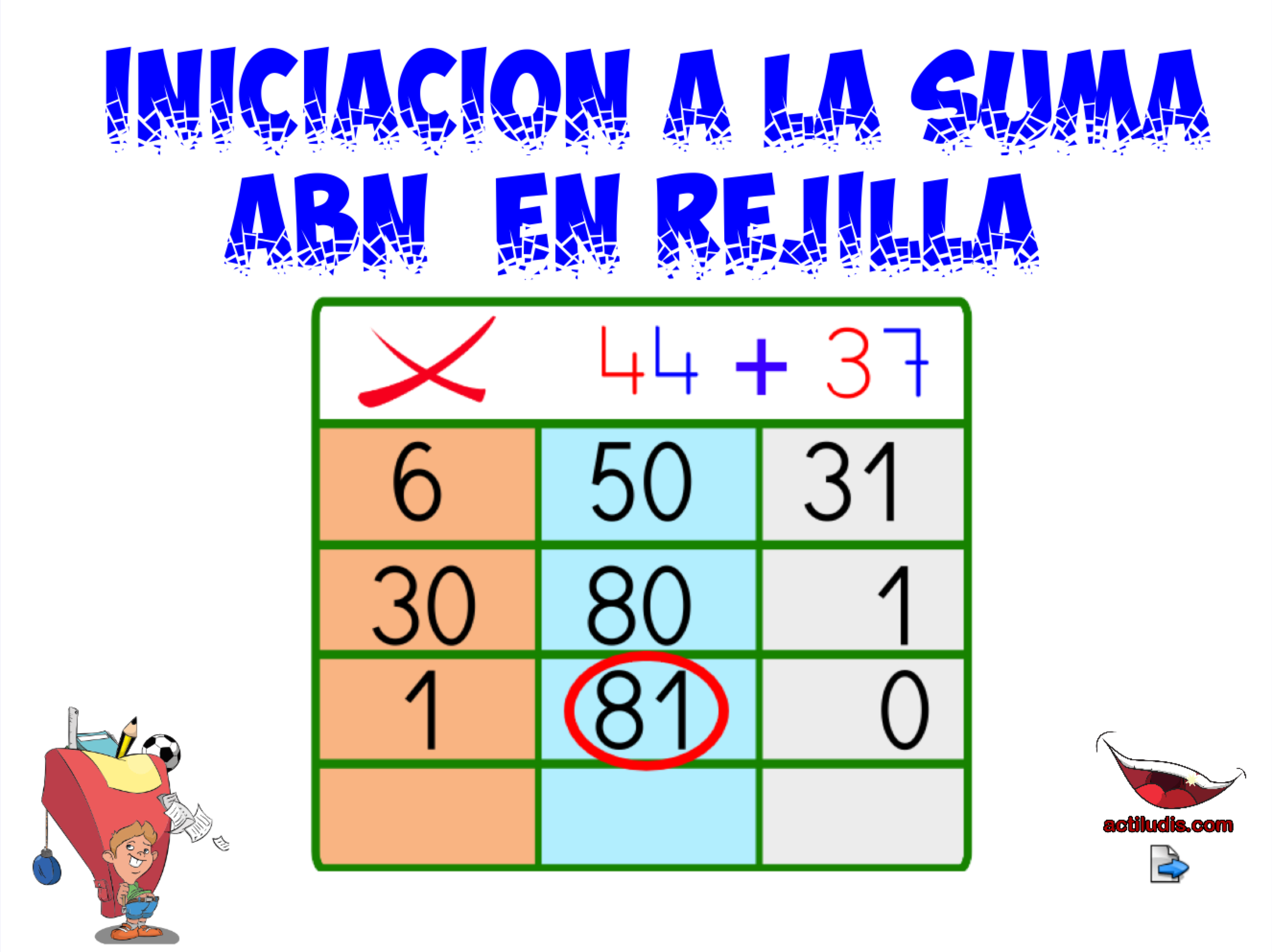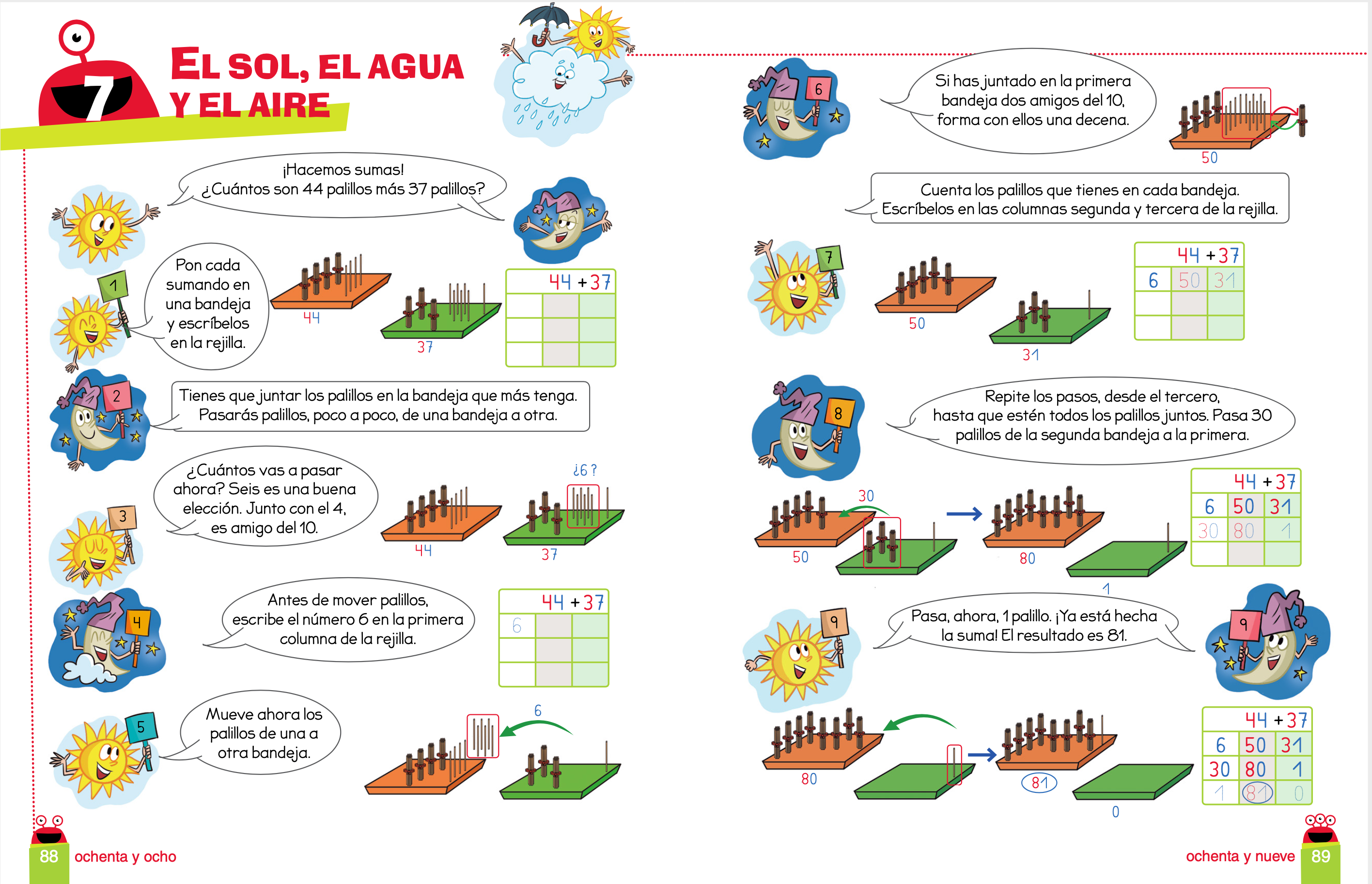 El fichero que compartimos es un rotafolios para el programa Activinspire que sirve de apoyo a la introducción de la suma en rejilla ABN. Está basado en las páginas 88 y 89 (que reproducimos en el artículo) del libro de texto Matemáticas ABN de 1º de la Editorial Anaya. Es por tanto una herramienta de apoyo al mismo, lo cual la hace muy útil para el momento en que hay que explicarle al alumnado todo el proceso.