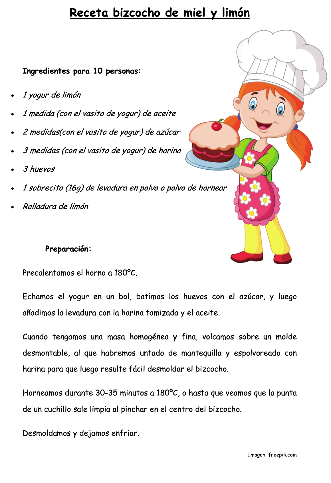 Doy la bienvenida a una nueva colaboradora en el blog. Se trata de Jessica Rodríguez Piñeiro del CEP «Pedro Caselles» de Tomiño (Pontevedra) que nos envía un material para trabajar la comprensión lectora, con preguntas, a nivel del Segundo Ciclo de Primaria con una receta de cocina de un «Bizcocho de miel y limón».