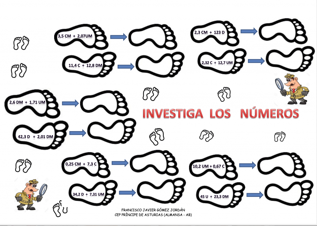 Las fichas están dentro del bloque de la Numeración y los alumnos tienen que averiguar que número hay dentro de cada huella y escribirlo donde corresponde.