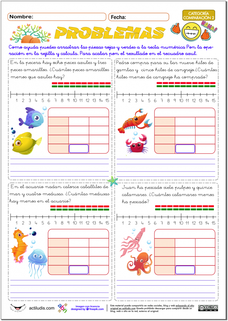 Continuamos aportando actividades para la resolución de problemas de dificultad creciente mediante las categorías semánticas. En esta ocasión presentamos problemas de comparación 2 que se resuelven mediante el cálculo de la diferencia entre las cantidades que se presentan y en las que preguntamos por la diferencia del menor respecto al mayor. Un ejemplo concreto sería: