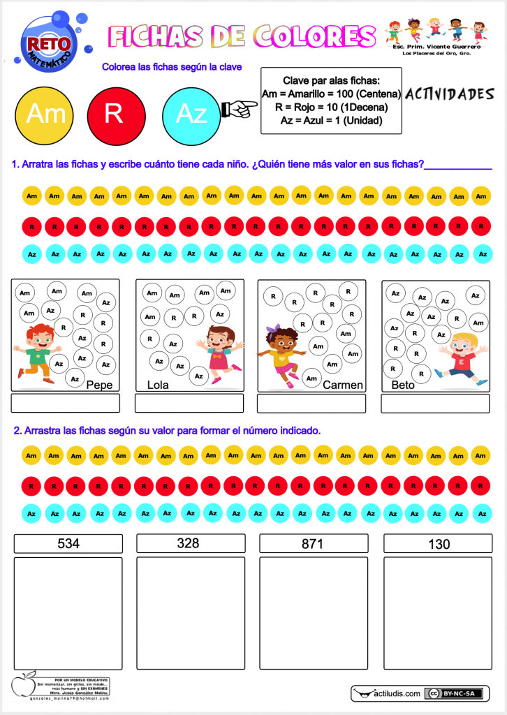 Con esta actividad se trabaja el reconocimiento de las centenas, las decenas y las unidades en los números de tres cifras por su valor de posición. Se presenta en varios formatos: componer un número a partir de la simbología del valor dado a cada pieza, la inversa, es decir a partir del número indicar cada una de las cantidades de cada cifra posicional y por último descomposiciones en C, D y U y recono de la posición de cada cifra.