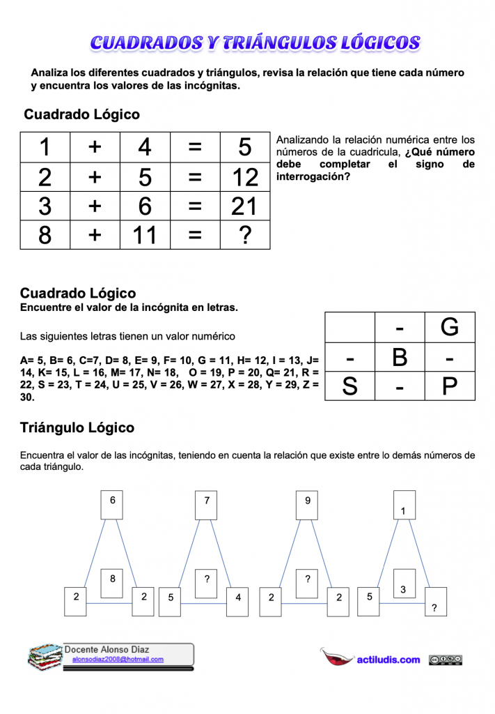 Nos comparte una actividad con cuadrados y triángulos lógicos en los que se busca en el estudiante desarrollar la lógica y la relación que existe entre cada número con el objetivo de encontrar el valor correcto de un número o letra. Este tipo de ejercicios de lógica, permiten que el estudiante acceda a otras dimensiones de pensamiento en la cual el estudiante aplica diferentes razonamientos con el fin de obtener la verdad sobre lo propuesto.