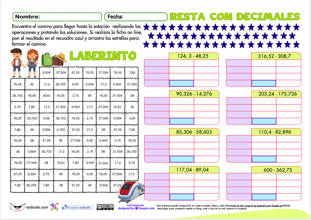 Con esta actividad trabajamos las restas con decimales mediante el algoritmo ABN. Se ha incluido la rejilla tanto en la ficha impresa como en la digital, aunque debido al nivel para la cual está pensada (desde 4º de Primaria en adelante si se trabaja el método ABN) es muy posible que muchos alumnos la empiece a realizarla de forma mental.