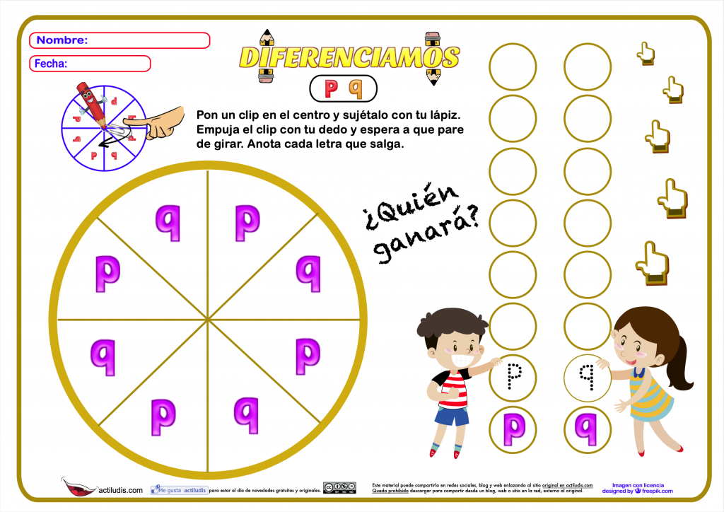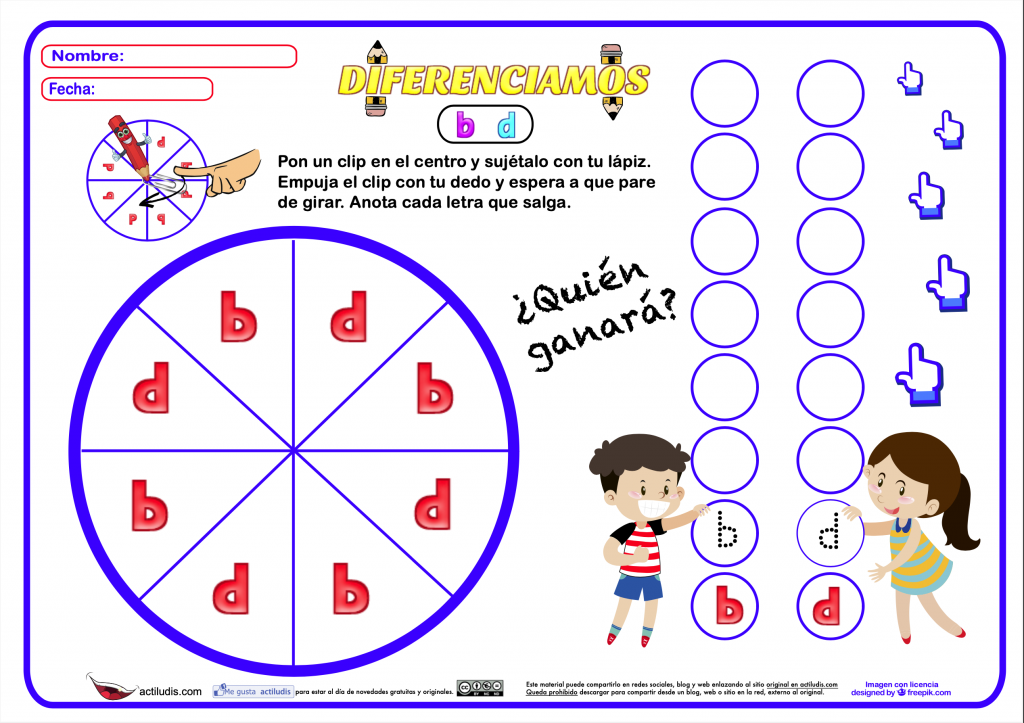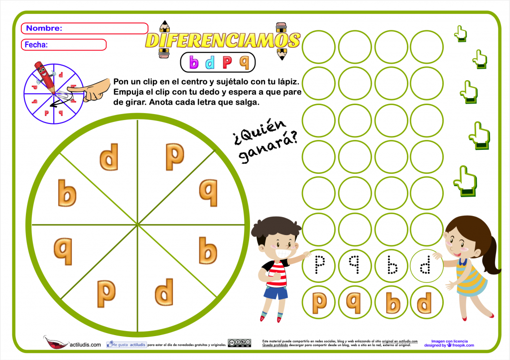 Para ayudar a diferenciar estas grafías he preparado este juego de ruleta con diversas combinaciones para trabajar la diferenciación entre las grafías «b y d», «p y q» y las cuatro juntas.