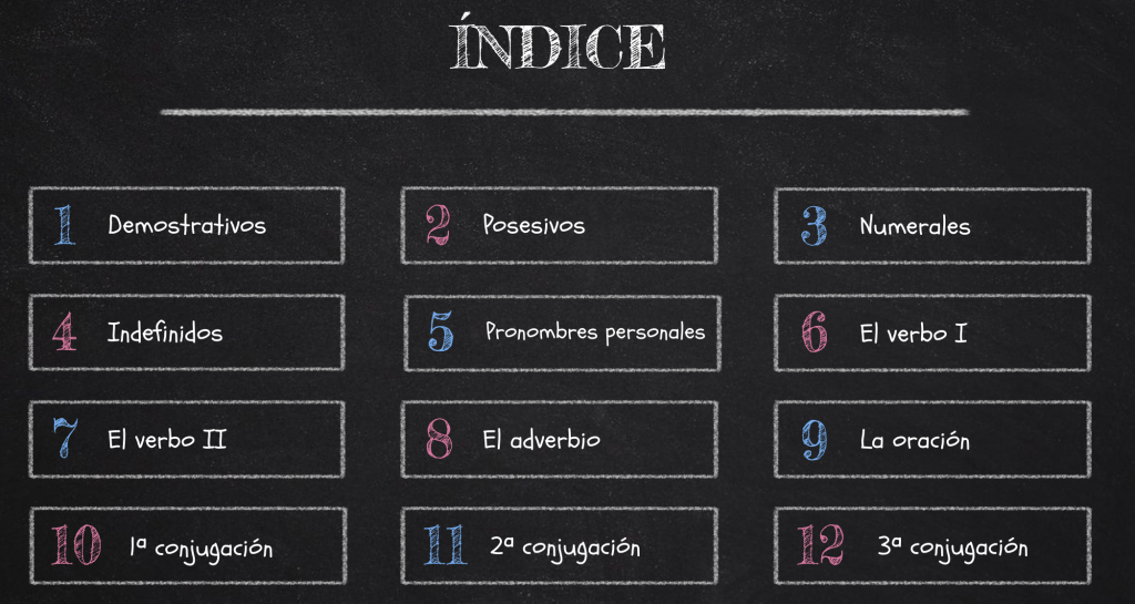 Se trata de un repaso de todos los aspectos gramaticales que se trabajan en cuatro de primaria, en el que se explican los contenidos que podemos ver en el siguiente índice, así como se muestran ejemplos de cada uno de ellos.