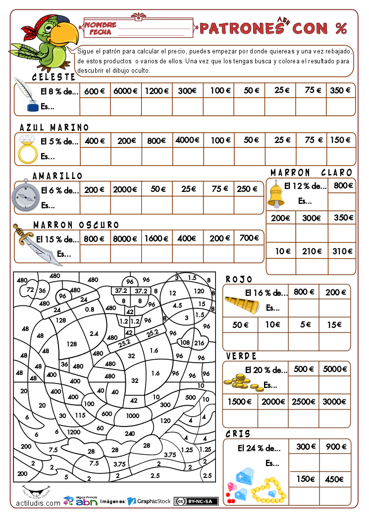 La siguiente ficha es para afianzar y ejercitar el cálculo pensando para tantos por ciento. En ella partiendo del primer cálculo (¿cuántas veces 100 aparece en el número indicado?) podemos calcular el resto de porcentajes mediante dobles, mitades, cuartos, y las suma o resta de los cálculo realizados anteriormente. En esta primera ficha me he limitado a cantidades de centenas completas, semi centenas y fracciones del cien.