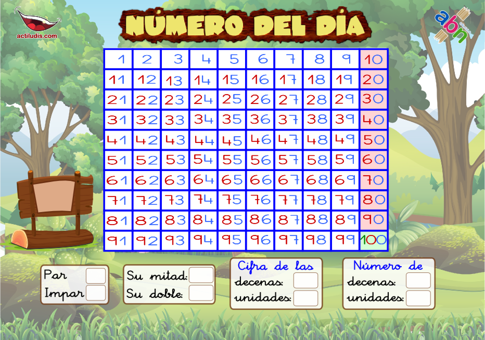 El siguiente material es para trabajar e número del día, o número protagonista, en el que se resapa diariamente un número de la tabla del cien. Es un material útil tanto para Educación Infantil como para 1º de Primaria.