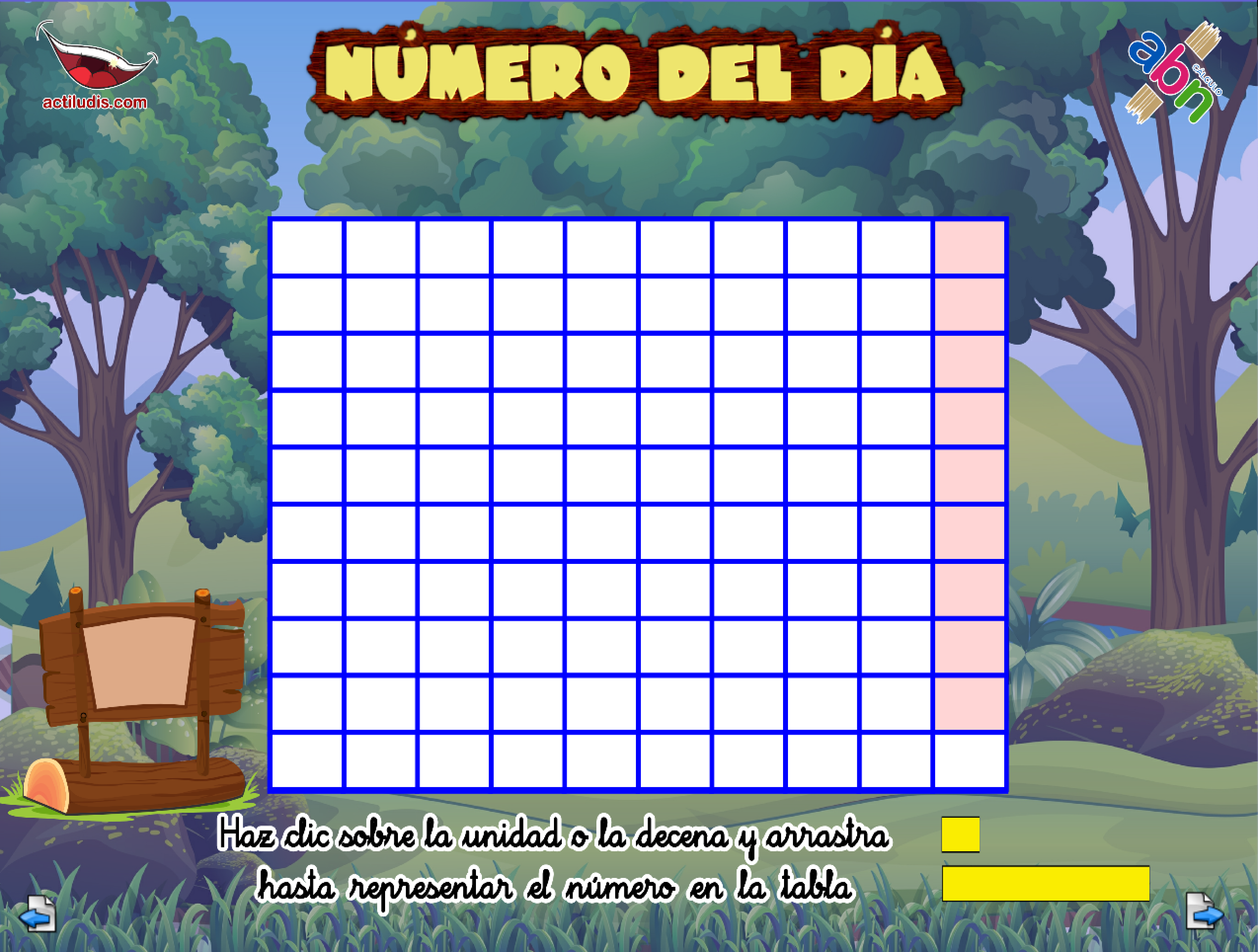 En esta pantalla se pide al alumno que represente el número del día en la tabla del 100, Para ello se debe hacer clic en la barra de la decena o en la unidad, con lo que aparecerá una barra o unidad que se puede arrastrar y completar hasta donde llegue el número del día.