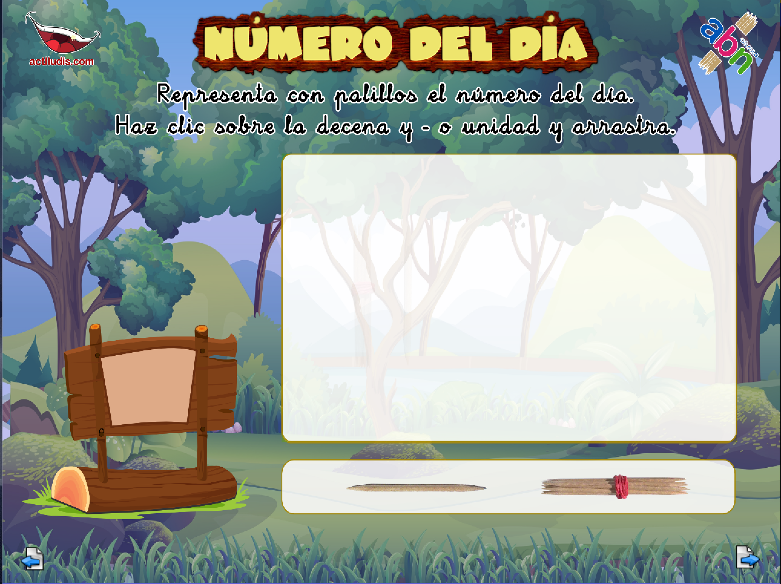 Nuevamente volvemos a pedir que se represente el número del día, pero en esta vez con unidades representadas con un palillo y la decena con 10 palillos. Igual que en la anterior pantalla pulsando sobre los palillos aparecerán para completar el número del día.