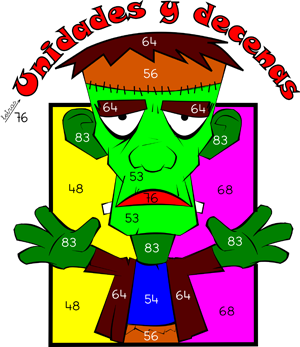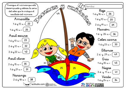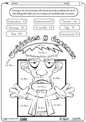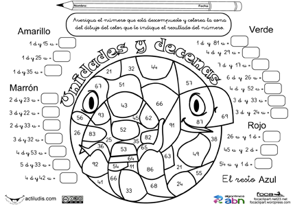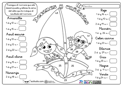 Así mismo encontrará fichas en las que se invierte el proceso de la actividad, es decir proporcionamos en las claves para colorear los números que corresponden a las soluciones, las cuales son a la vez solución de más de una forma diferente de expresar el mismo número con decenas y unidades.