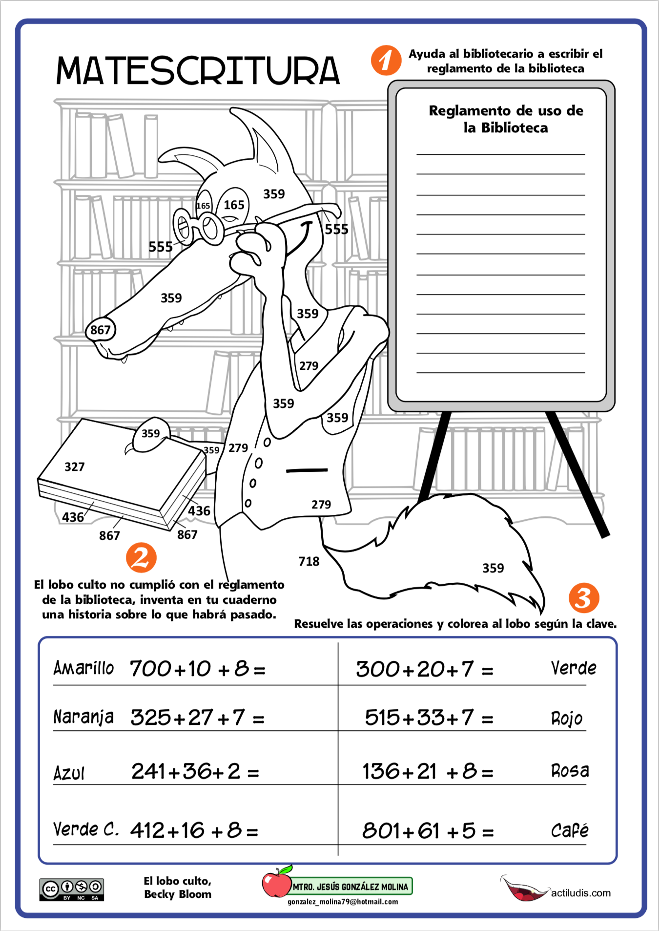 El nombre de «Matescritura» quiere expresar que en la misma actividad se combina el cálculo y la expresión escrita, ya que por una parte se pide que se resuelvan las operaciones para colorear al lobo según las claves y por otra se pide que inventen una historia en la que el lobo culto no cumplió con el reglamento de la biblioteca, por lo que deberán inventar, en tu cuaderno, una historia sobre lo que habrá pasado.