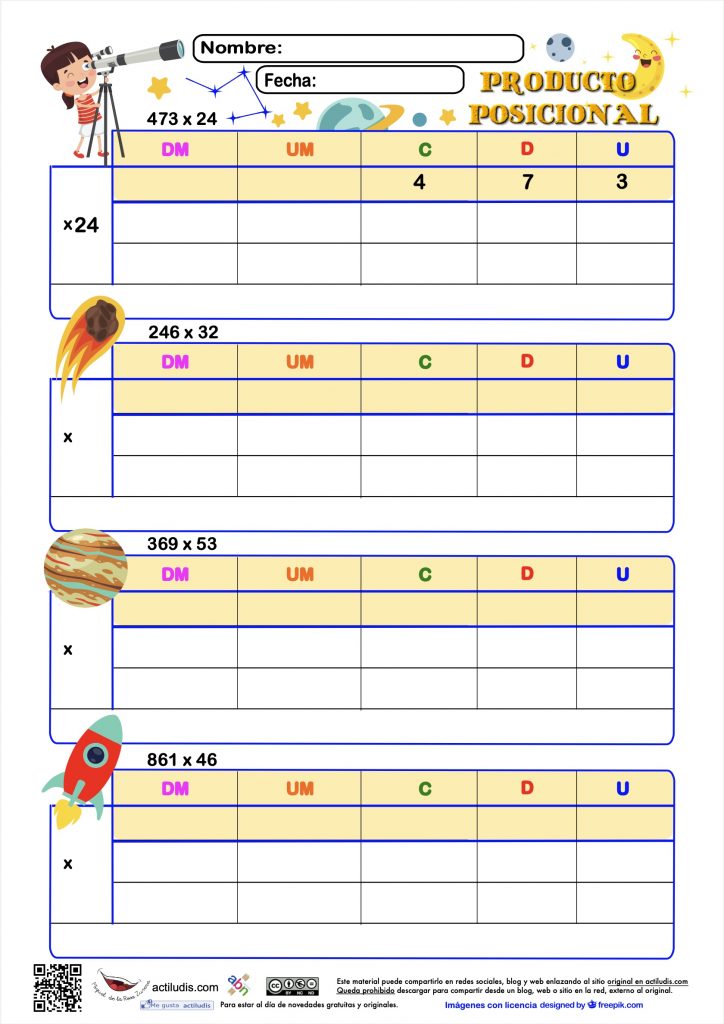 Actividad para practicar y dominar el cálculo posicional del método ABN. Estos producto se pueden realizar a través de la rejilla ABN, pero no se trata de eso, sino de empezar a practicar el producto posicional.
