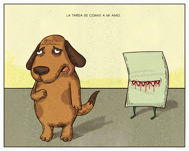 Chiste gráfico del dibujante humorístico Alberto Montt que ilustra muy bien las excusas extrañas con las que el alumnado, y quizás muchos de nosotros en su tiempo, le dijimos a nuestro maestro/a, y que resumen otra como: «se me ha olvidado», «mi hermano lo manchó, rompió,…», » a mi no me lo dío»,… sin lugar a dudas un círculo sin fin, que para mi no deja de ser simpático.