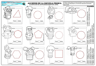 Ficha para reconocer el nombre de polígonos según el número de sus lados. Tienen que contar el número de lados y en las claves localizar, junto al nombre del polígono el de los personajes de «la escuela fresca».