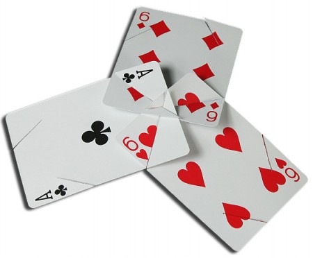 A cada tarjeta debemos hacerle cuatro ranuras para cortar y encajar unas con otras (los cortes debes estar cortados con precisión). Para que resulte más fácil puedes imprimir el archivo PDF del modelo que tienes a continuación con lo cual tendrás el tamaño exacto. Una vez impresa la tarjeta, basta con cortar las ranuras y utilizarla como plantilla trazando, con un lápiz, los cortes guía en cada naipe.
