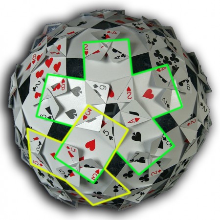 Para unir estos grupos, en las dos ranuras de la parte opuesta de cada naipe ensamblamos un naipe de otro grupo de tres (en amarillo en la imagen). Una vez ensamblado se formará un pentágono interno cuyos extremos formarán una estrella de naipes de cinco puntas (en verde en la imagen).