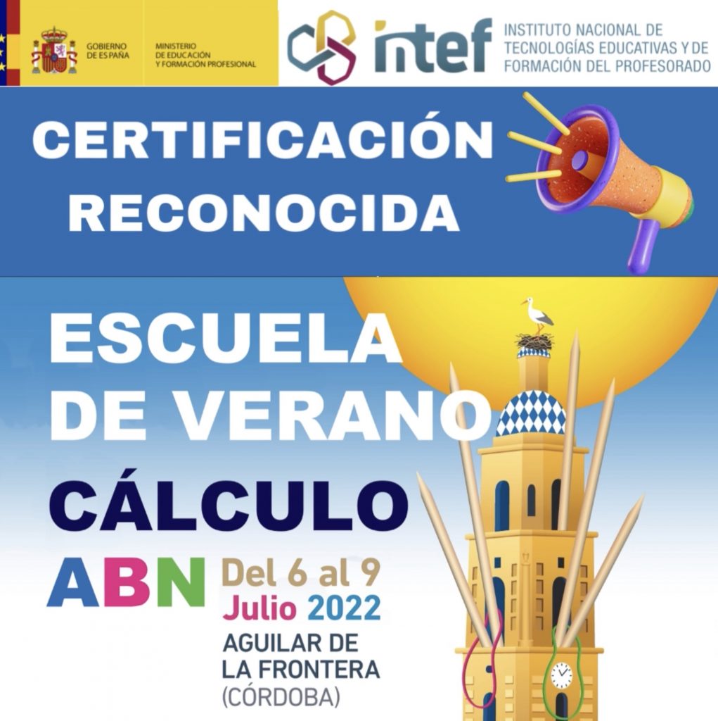 Además del reconocimiento del INTEF, a los participantes a la «I Escuela de Verano ABN» se les otorgará una certificación acreditativa de la Asociación Matemática Cálculo ABN, de los talleres realizados.