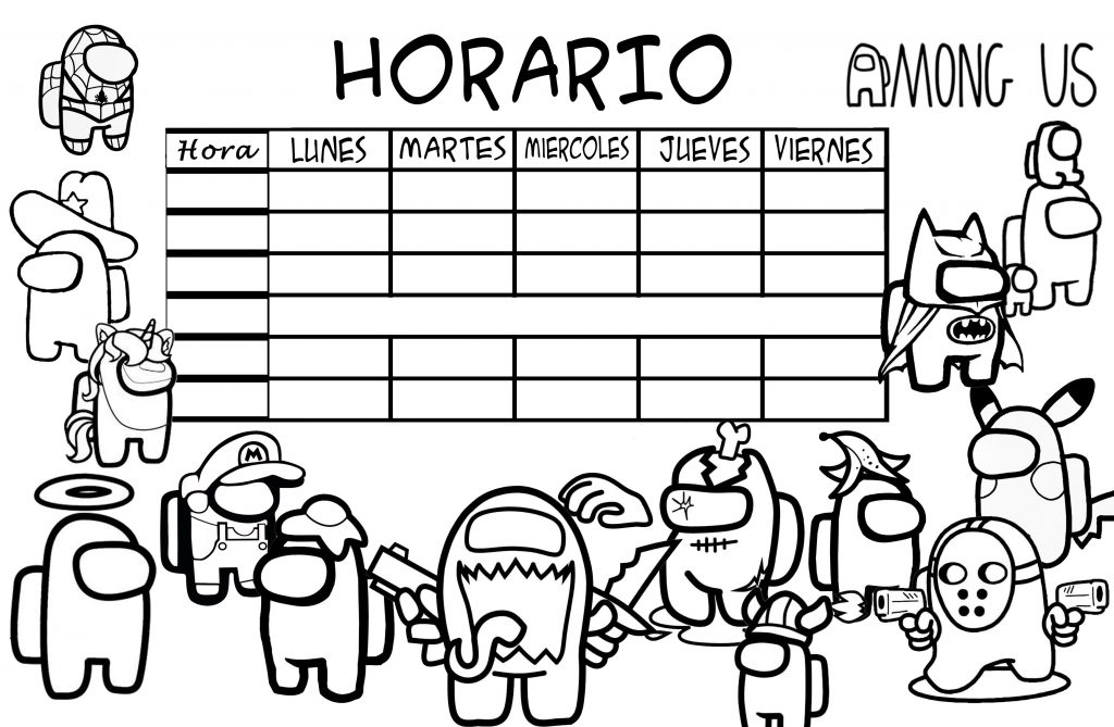 Damos la bienvenida como colaborador y las gracias a Christian Padial Barcina del CEIP «Freinet» de Almería, que nos remite dos horarios para colorear. Uno en dos formatos de 5 y 6 filas, con los personajes de la serie Stranger Things, y el otro con los simpáticos Among Us.