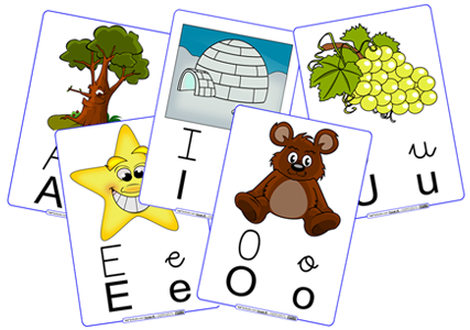 Son las imágenes que corresponden a cada una de las vocales que se usan en las actividades y con las que poder decorar el aula.