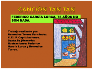 Para finalizar el Otoño, y dentro del 75 aniversario de la muerte de Lorca, Remedios Torres Fernández, profesora del C.E.I.P. Capitulaciones de Santa Fe (Granada) nos envía una actividad muy motivadora para Infantil: la lorquiana «Canción Tan tan». Además de la actividad con sus respectivas explicaciones, incluimos los dibujos para hacer … Sigue leyendo Canción Tan Tan