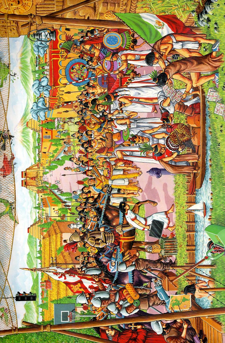 Aprovechando la conmemoración del Día de la Hispanidad (Raza) dejo un juego para trabajar con los críos la lógica y la observación. Se trata de encontrar 21 anacronismos ambientados en un dibujo de la conquista de los aztecas, por Hernán Cortés.