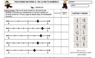 Actividad para trabajar la fracción de un número en la recta numérica, y en concreto cuando la fracción es impropia, es decir mayor a la unidad. En la ficha nos encontramos con una serie de fracciones que deben recortar y pegar en los recuadros de fracción y número mixto el … Sigue leyendo Fracciones mayores a la unidad en la recta numérica