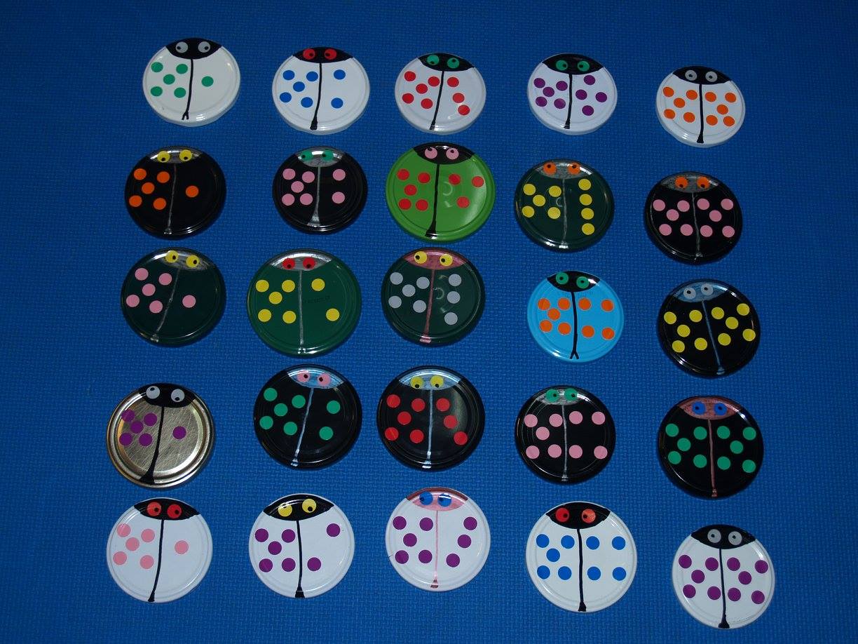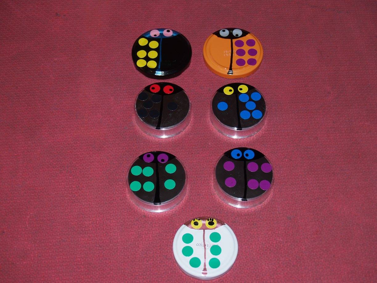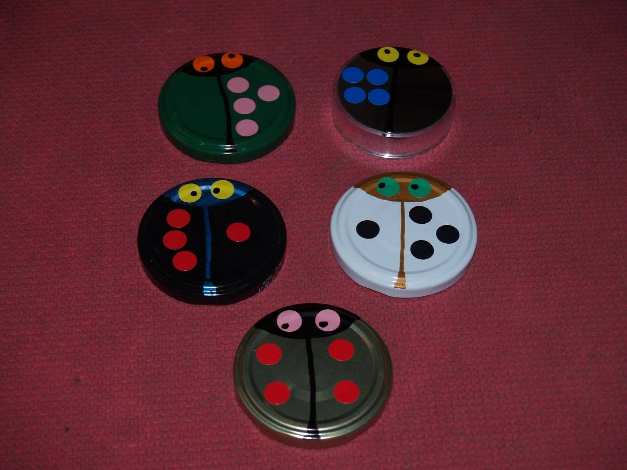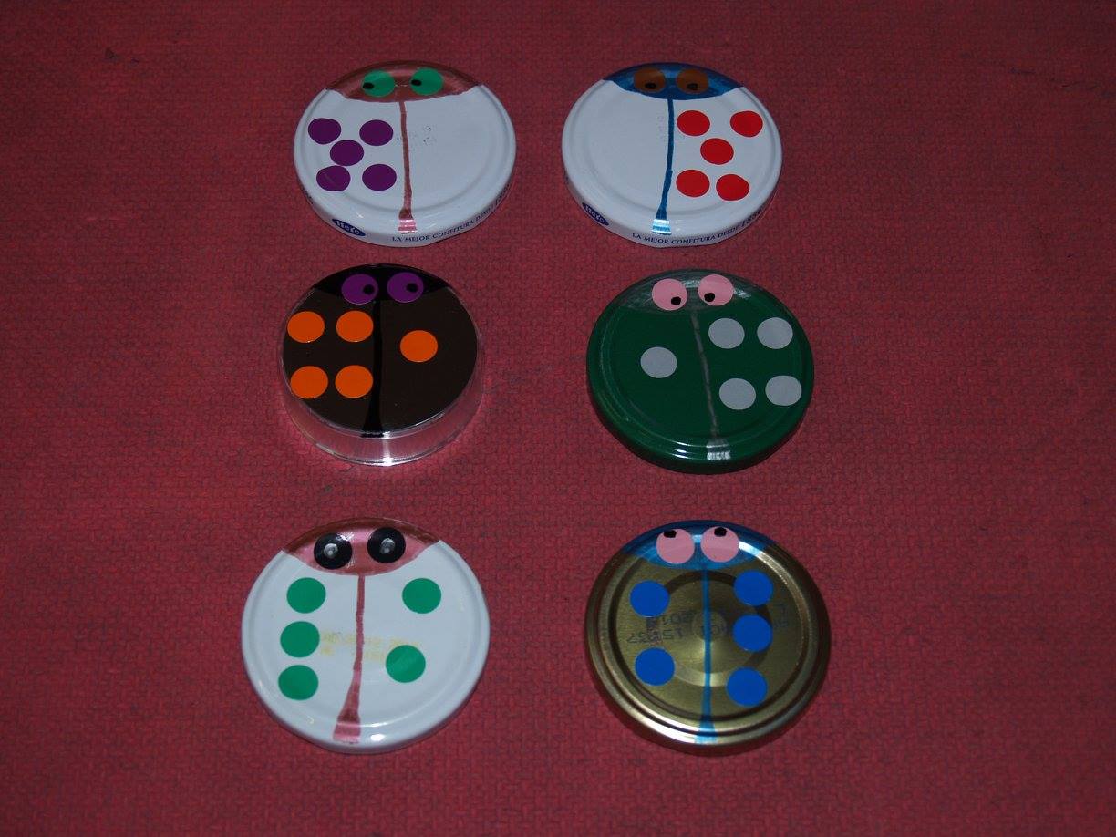 Conchi Bonilla Arenas del CEIP Sagrado Corazón de Getafe (Madrid) ha publicado en el Facebook ABN una estupenda máquina didáctica para superar la Fase 1 de la suma, además de utilizar los deditos hasta la saciedad, ha ideado estas mariquitas que a los niños les están encantando. Están hechas con las tapas lisas de los botes de conservas, rotuladores para objetos metálicos de la marca Giotto y gomets de colores, desde ahí la imaginación y el arte están servidos y nos asegura que ella arte tiene poco, lo más básico (Pero yo creo que lo suple con mucha imaginación y creatividad). La comprobación del resultado está por detrás de la tapa.