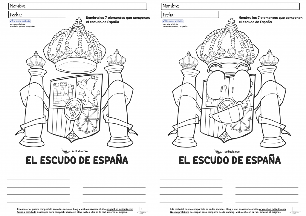 Use uno u otro se trata de escribir en el espacio indicado los diferentes elementos que lo constituyen. En el caso del dibujo humanizado, os sugerimos que previamente se observe el escudo real, ya que los ojos y otros elementos tapan algunos de ellos. Os dejamos el enlace al escudo de España en la wikipedia en el que además se analizan e indican todos los detalles del mismo.