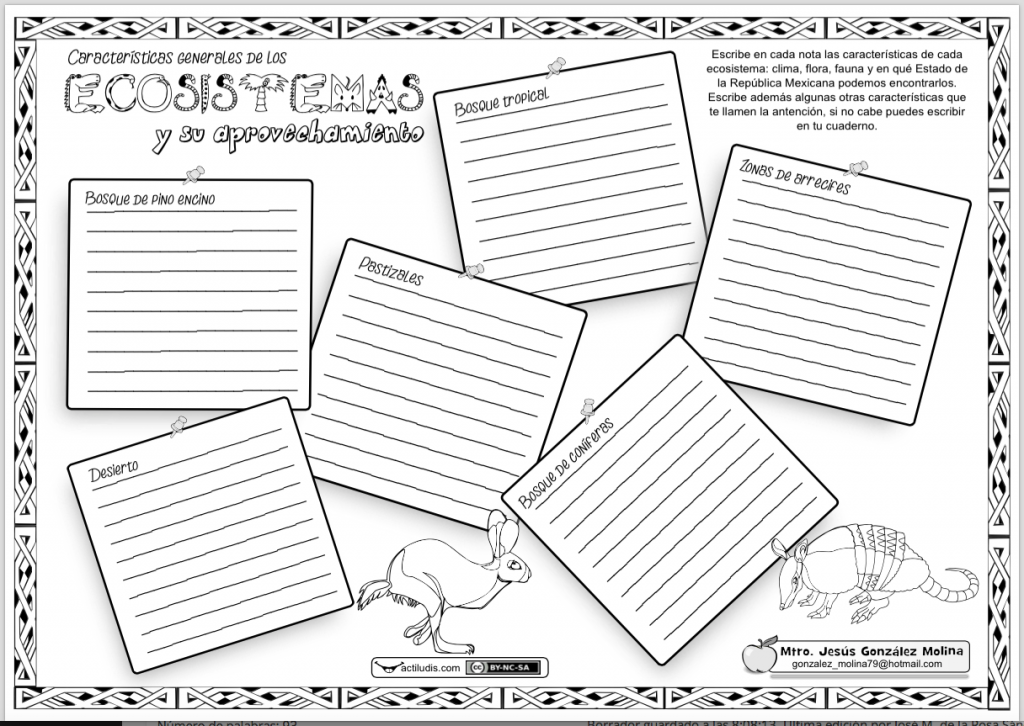 La siguiente fichas elaborada por Jesús González Molina de la Escuela Primaria Vicente Guerrero, desde Los Placeres del Oro, Guerrero, México nos sirve para que el alumnado escriba en cada nota las características de cada ecosistema: clima, flora, fauna, así como otras características que les llame la atención.