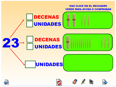 Lo más normal en los libros de texto es descomponer un número exclusivamente en decenas y unidades (23 en 2 decenas y 3 unidades) y cómo máxima descomposición indicar las unidades que corresponden a dichas decenas (en el ejemplo 2 decenas son 20 unidades). Sin embargo con este tipo de ejercicios queremos profundizar áun más en el dominio de la descomposición numérica, lo cual les proporcionará una mayor capacidad en el cálculo posterior. En el ejemplo anterior 23 podemos descomponerlo en 2 d y 3 u, en 1 d y 13 u, y en 23 unidades (estas 23 unidades vista como tales, cuya agrupación generará decenas), lo cual irá ampliándose en con números mayores.
