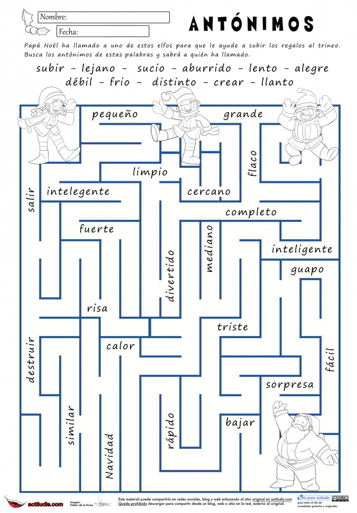 En la siguiente actividad se trabajan los antónimos para lo cual he preparado un laberinto en el que se deben encontrar los antónimos de las palabras que aparecen en la cabecera del laberinto.