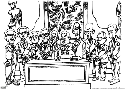 Mural con escritores de la Generación del 27, hecho a partir de los dibujos realizados por Idígoras y Pachi en una publicación de la Diputación de Málaga, inspirados en la fotografía que dichos poetas se hicieron en 1927 durante el homenaje a Góngora en el Ateneo de Sevilla.