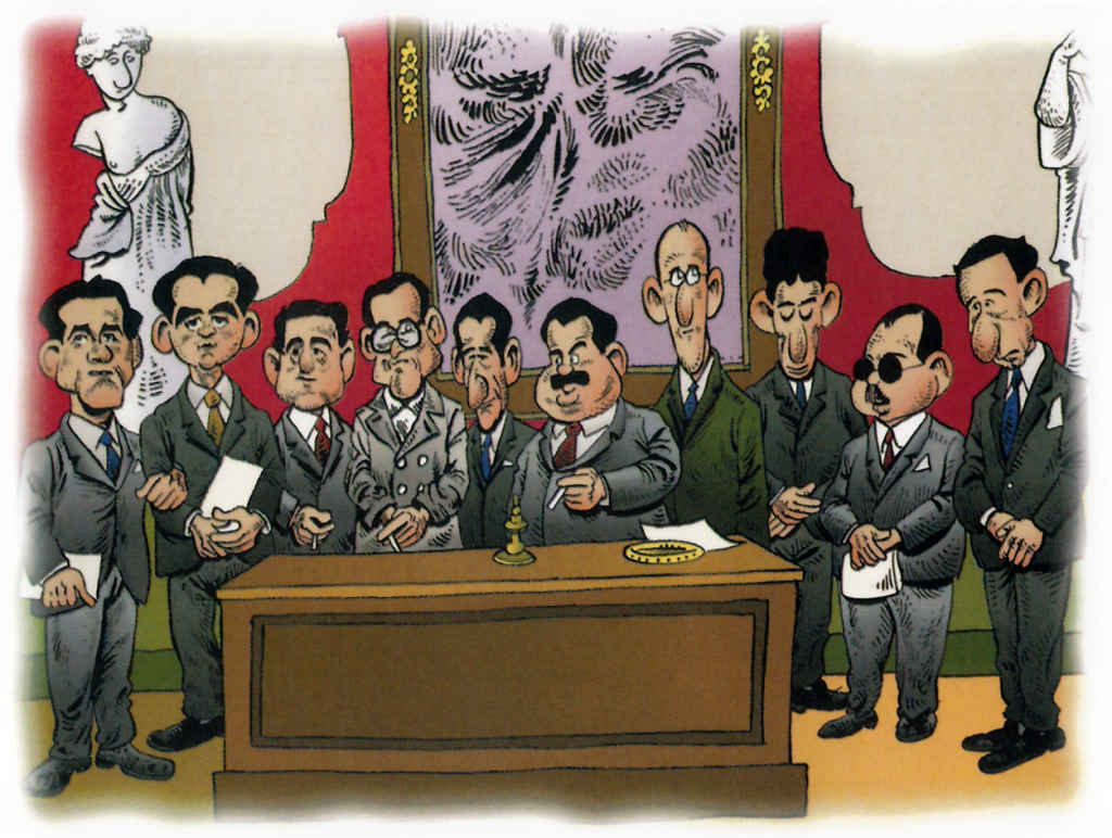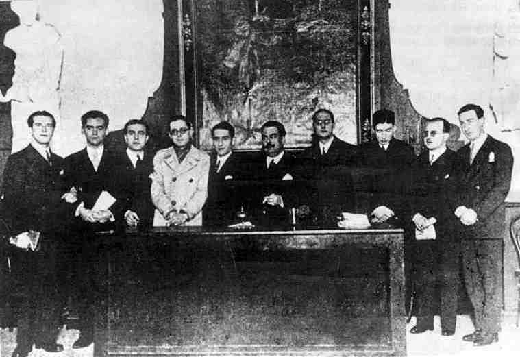 De izquierda a derecha: Rafael Alberti, Federico García Lorca, Juan Chabás, Mauricio Bacarisse, J.M. Platero, Manuel Blasco Garzón (Presidente del Ateneo), Jorge Guillén, José Bergamín, Dámaso Alonso y Gerardo Diego.