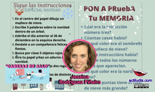 Jessica Rodríguez autora del portal «Cabezas de allo», y colaboradora de Actiludis nos propone una actividad de comprensión lectora y memoria, a través unas instrucciones. Se trata de seguir unas instrucciones en un papel en el cual irán haciendo todo lo que les indica. Una vez hecho se les hace … Sigue leyendo Prueba de comprensión lectora y memoria. Especial Navidad