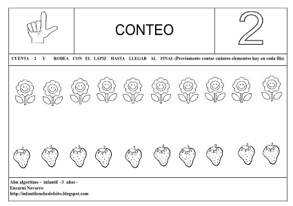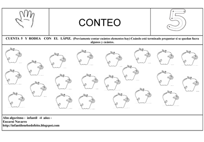 El primer grupo que nos ha enviado recientemente corresponden al trabajo con el número 5 que añadimos al publicado previamente y dedicado al 2, 3 y 4. Con ellas contamos y rodeamos de 2 en 2, de 3 en 3 y de 4 en 4. A los peques no se le pide del tirón que lo rodeen de 3 en 3, sino que se les dice «cuenta 3 y rodea, luego cuenta 3 otra vez y rodea». En las primeras fichas no sobra ningún elemento pero en otras sí y se les pregunta cuántas quedan fuera. Si se quiere, en las fichas también se repasa por dentro la grafía del número dado y se colorean los dibujos.